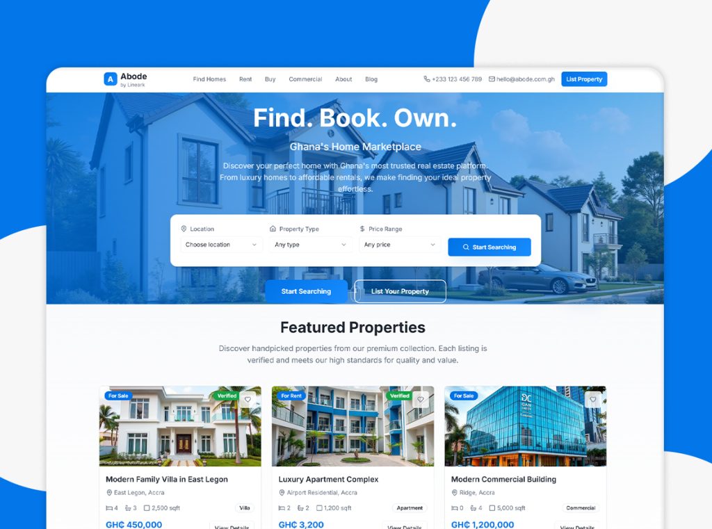 A real estate tech platform simplifying how Ghanaians discover, book, and own property. Abode connects buyers, renters, agents, and developers in a trusted digital marketplace designed for cultural relevance and convenience.